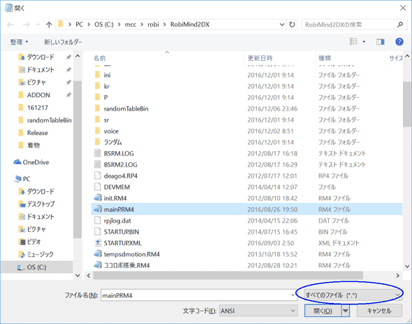 開くダイアログのファイルの種類を「すべてのファイル」に切り替えるとロビのプログラムも表示されます。